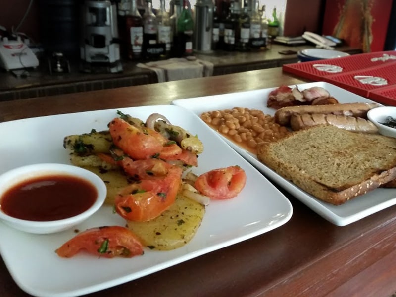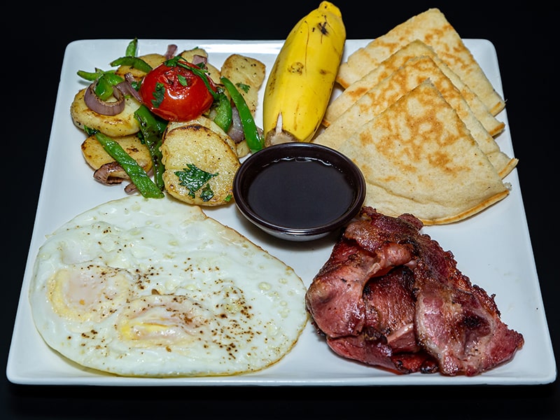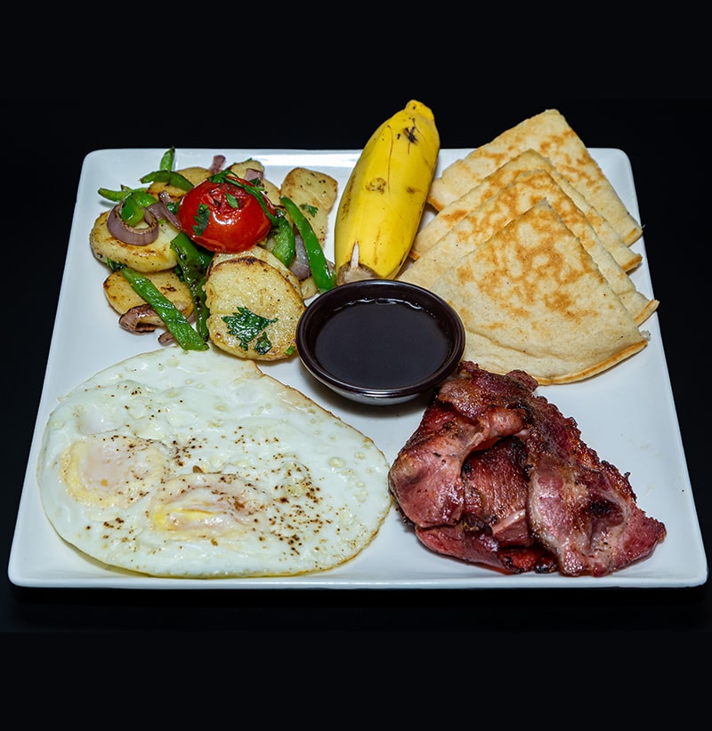 Hash brown potatoes, fried eggs, bacon, pancake, banana, seasonal fresh fruit juice and tea/coffee