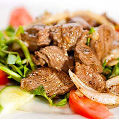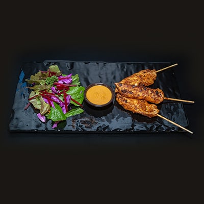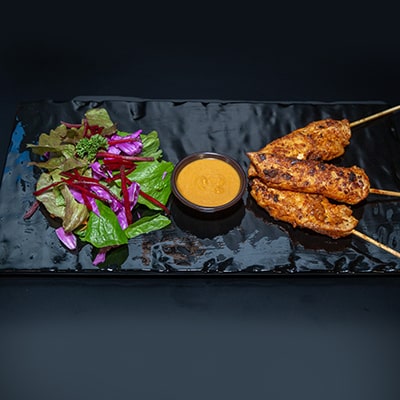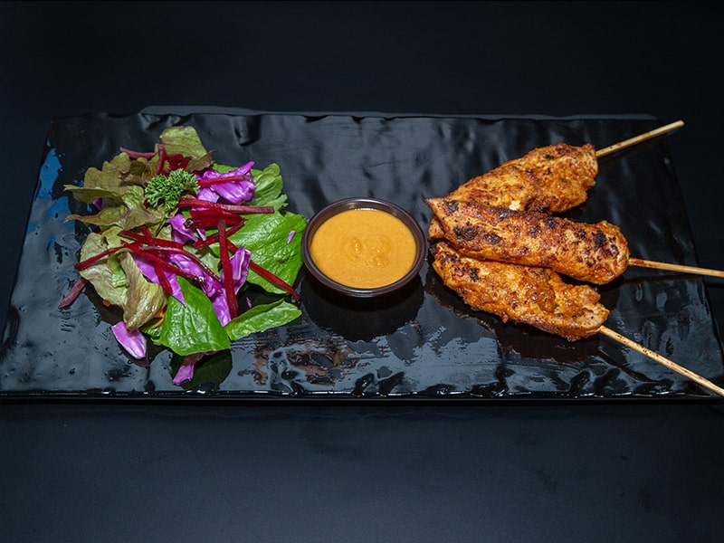 Grilled chicken Indonesian style on organic salad with peanut sauce