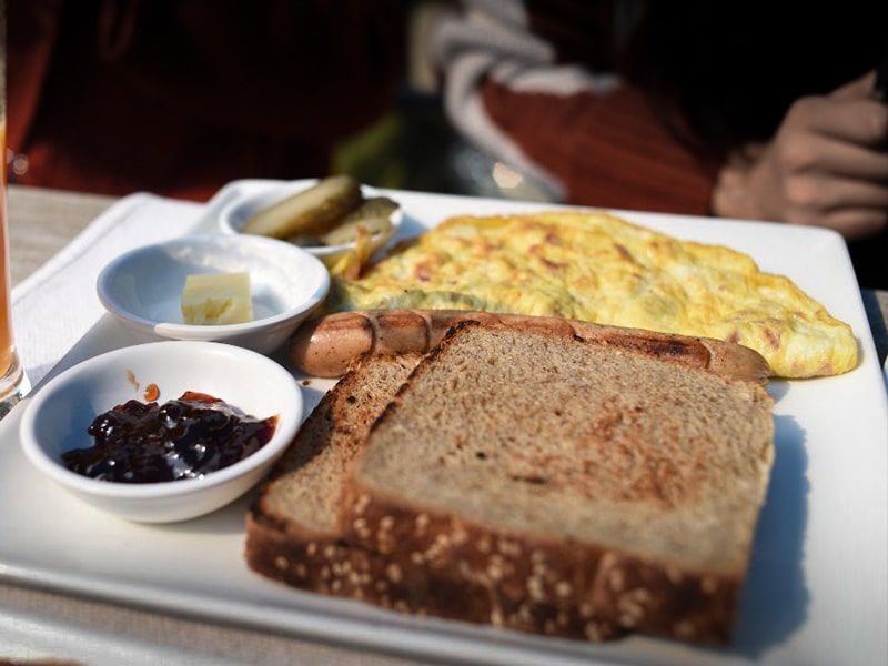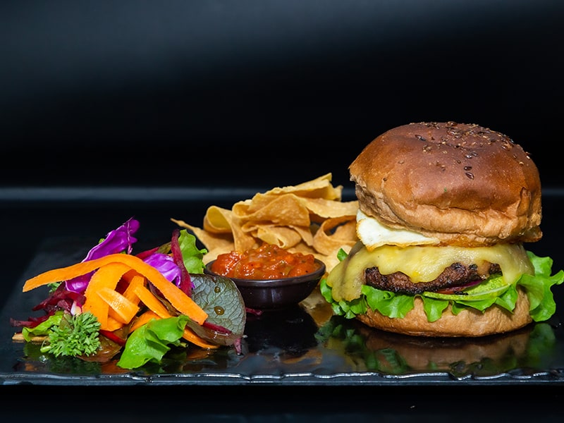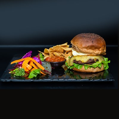 Grilled homemade juicey tender beef patty with organic lettuce, sliced tomato, onion, mushroom, fried egg, cheese and mustard mayo